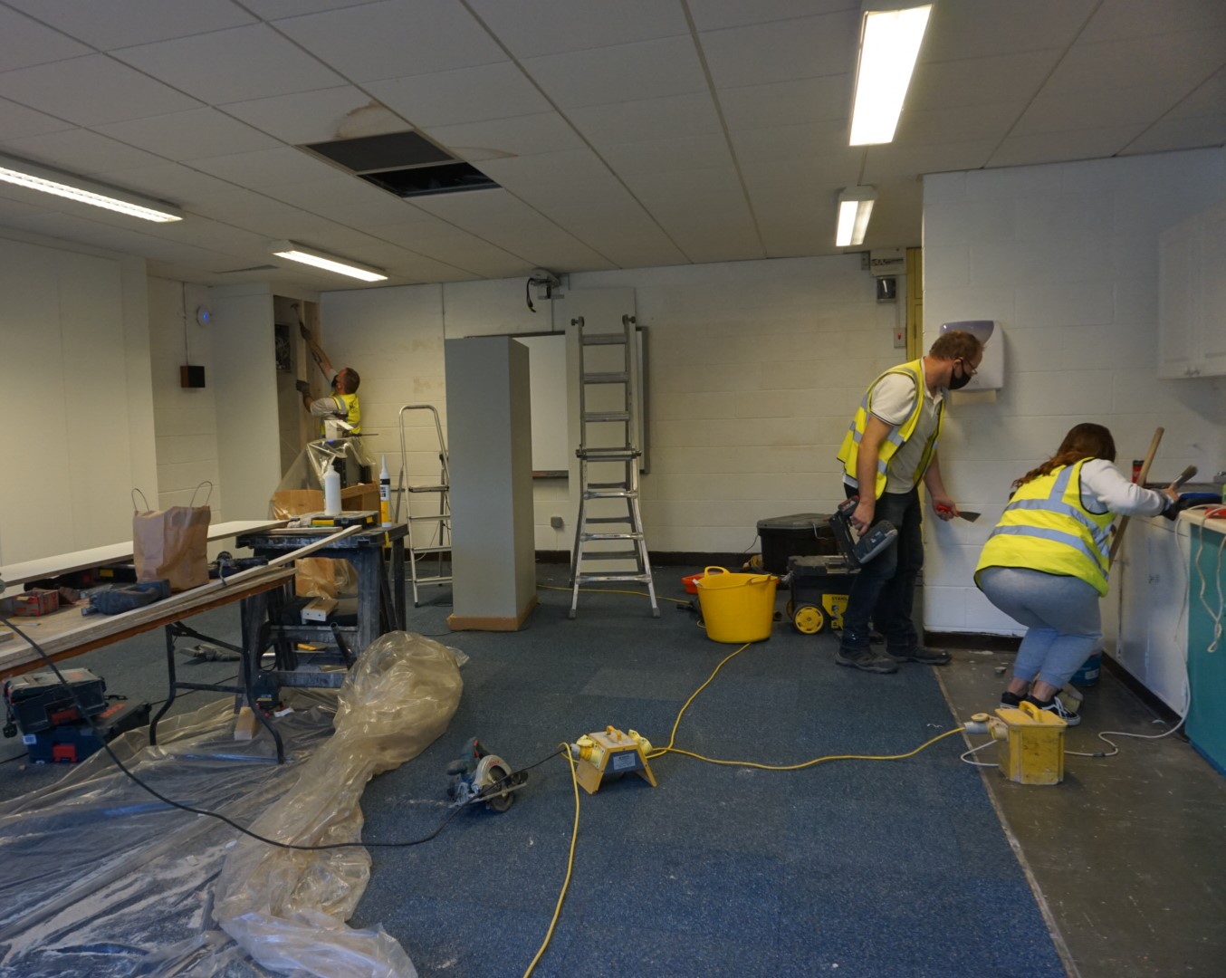 In terms of the works carried out, the team commenced on Friday evening, stripping out all of the old furnishings, carpet and cabling, and giving the walls a fresh coat of paint. Saturday was a long day, with a new floor being laid and the team set about building wall units to close in all the open rack shelving. After another coat of paint and a final clean up, the room was ready!