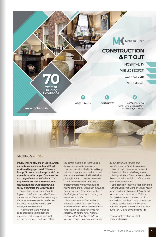 Established in 1950, this year marks the 70th anniversary of McKeon Group, which remains a family business. ISO certified for more than two decades, McKeon Group offers expert construction, fitout and building services. The Group delivers projects, services and maintenance across a range of sectors for State, local authority, FDI and private clients. For more information, contact McKeon.ie